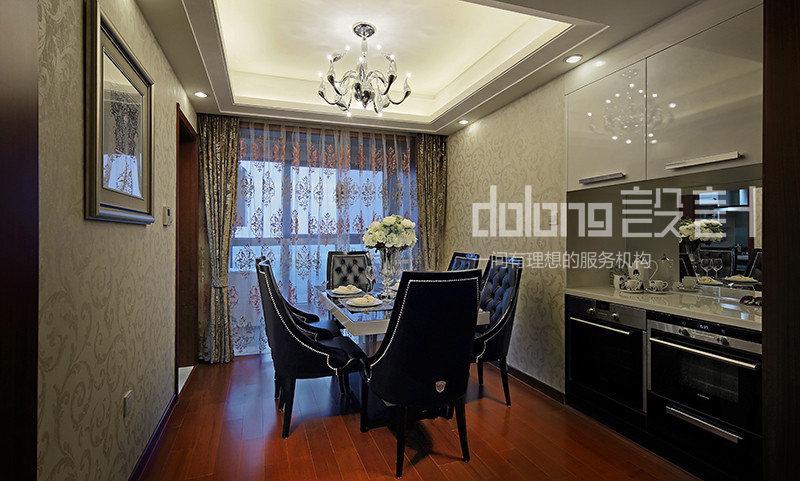 餐厅,原装修自带的餐边柜,只有简单的一组柜子,业主想整合更多的厨房电器在这里。通过局部硬装改造,业主想要的烤箱、蒸箱都放在了这里。