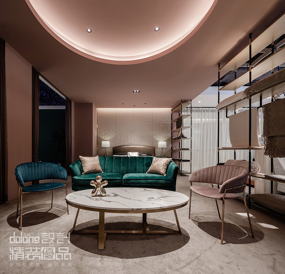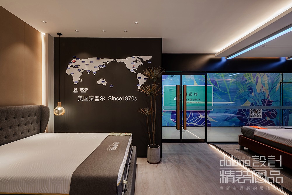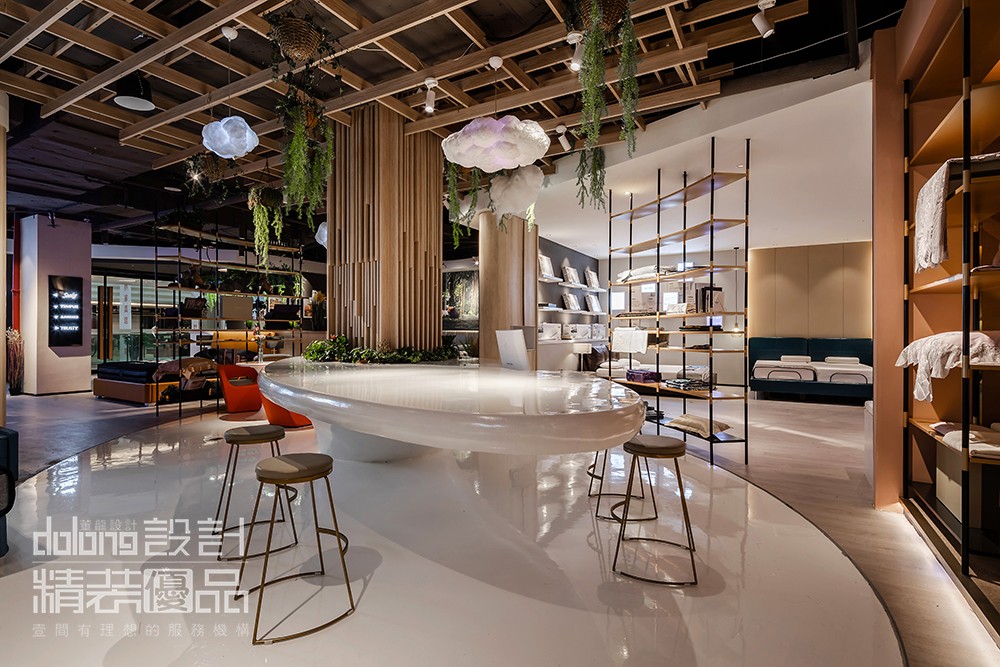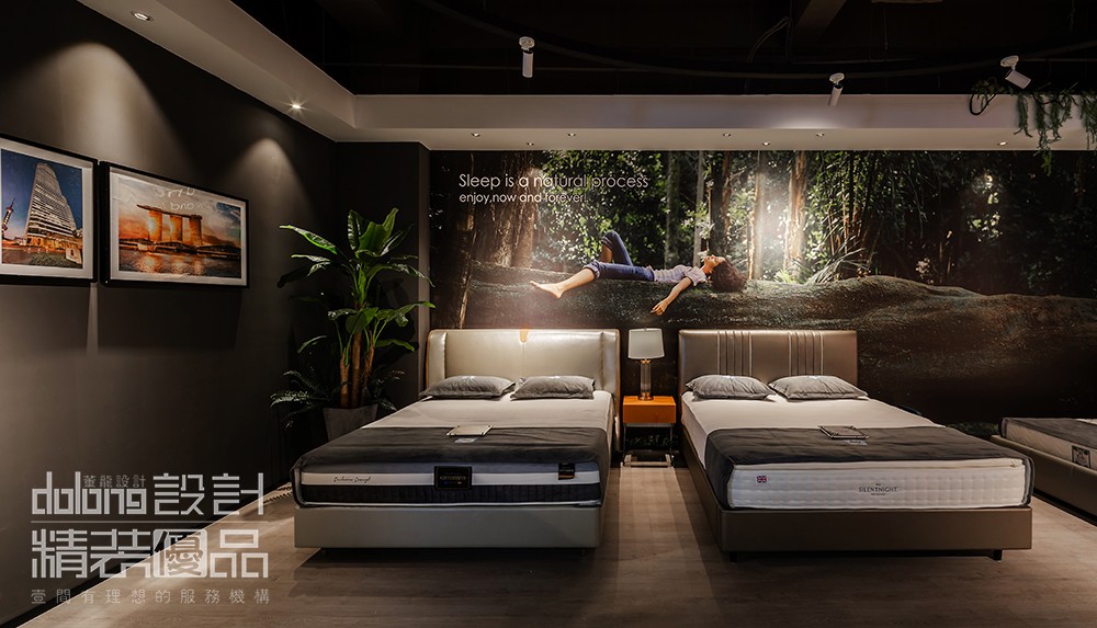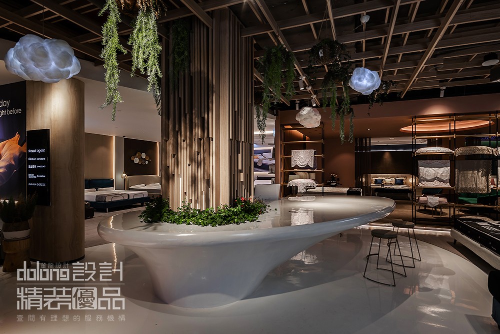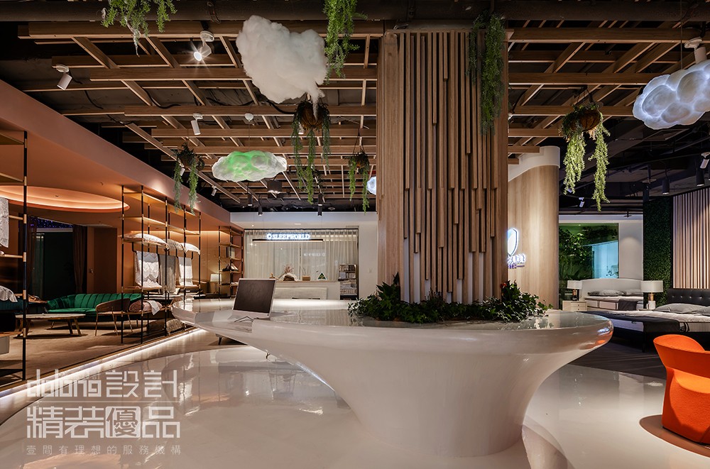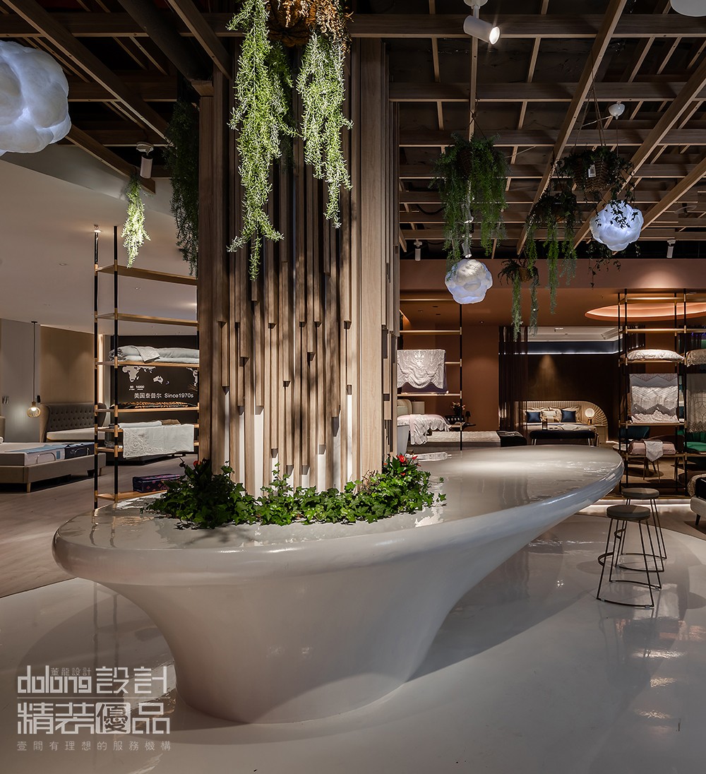 本案为睡眠馆设计,展厅主要以自然元素为题材,将星空,云朵,森林,鸟等自然景致融入到设计中,环保、舒适、自然,的设计蕴意和产品理念高度重叠,色彩倾向自然原木色,设计师用了大量的仿真绿植,接待台中间的柱子装饰成树的形态,置身其中,仿佛进入热带雨林。