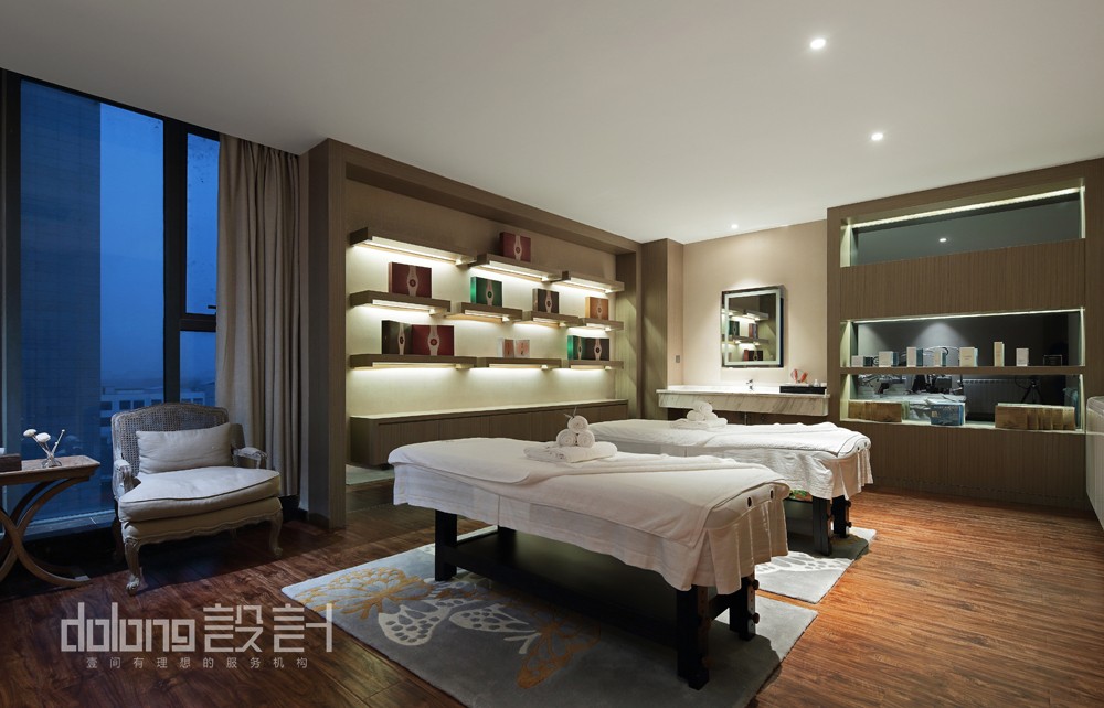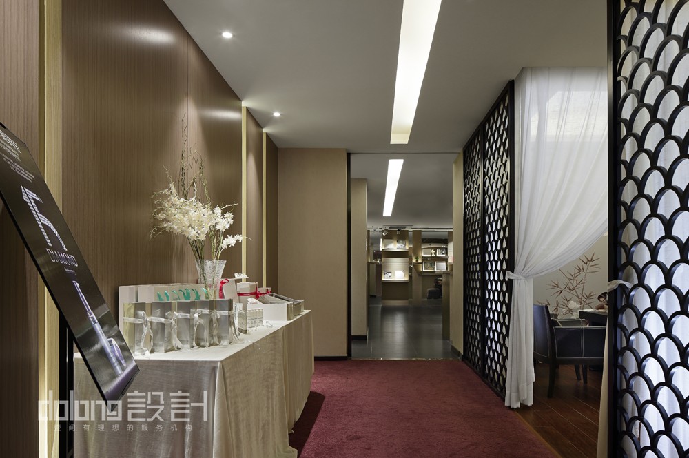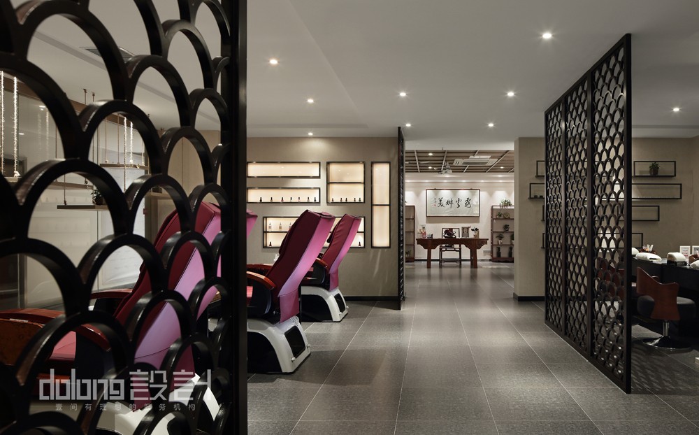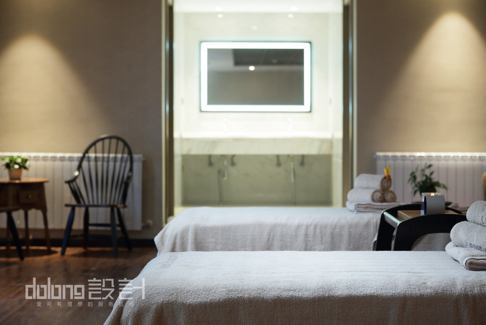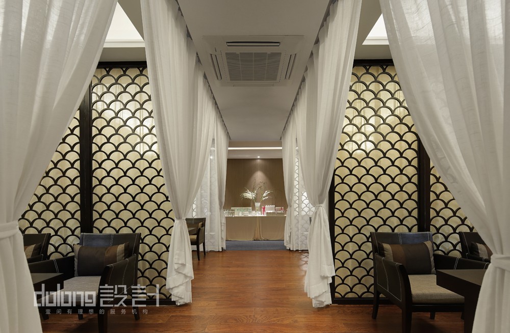 茶座区以鱼鳞纹花格、白色纱帘稍作遮挡,是休闲的好去处。设计师考虑到私密性诉求,在西北区辟出了SPA包间,在独立的房间内营造出温馨的氛围,独享这私人领域带来的舒适感。