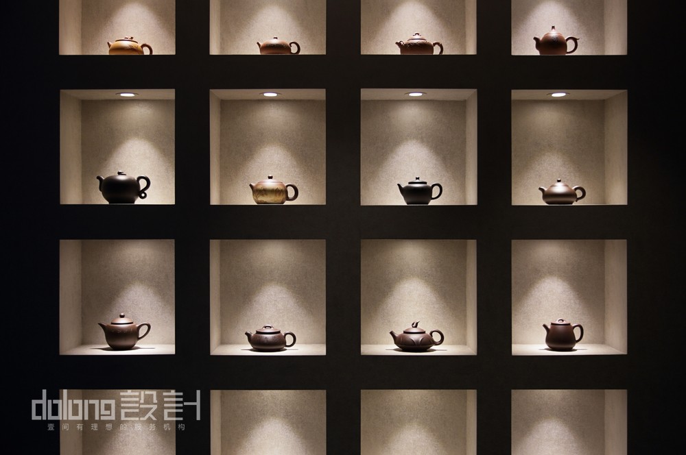 接待大厅地面石材拼花是将黑白灰三色的砖敲碎后随机组合排列而成,现代感十足。移步至大厅,两侧以中式鱼鳞纹花格作装饰,顶面采用麻质墙纸与木线条交错,地铺青灰色砖,墙边是麻线吊木板装饰,壁龛内摆满紫砂壶装饰,中式韵味风雅别致。