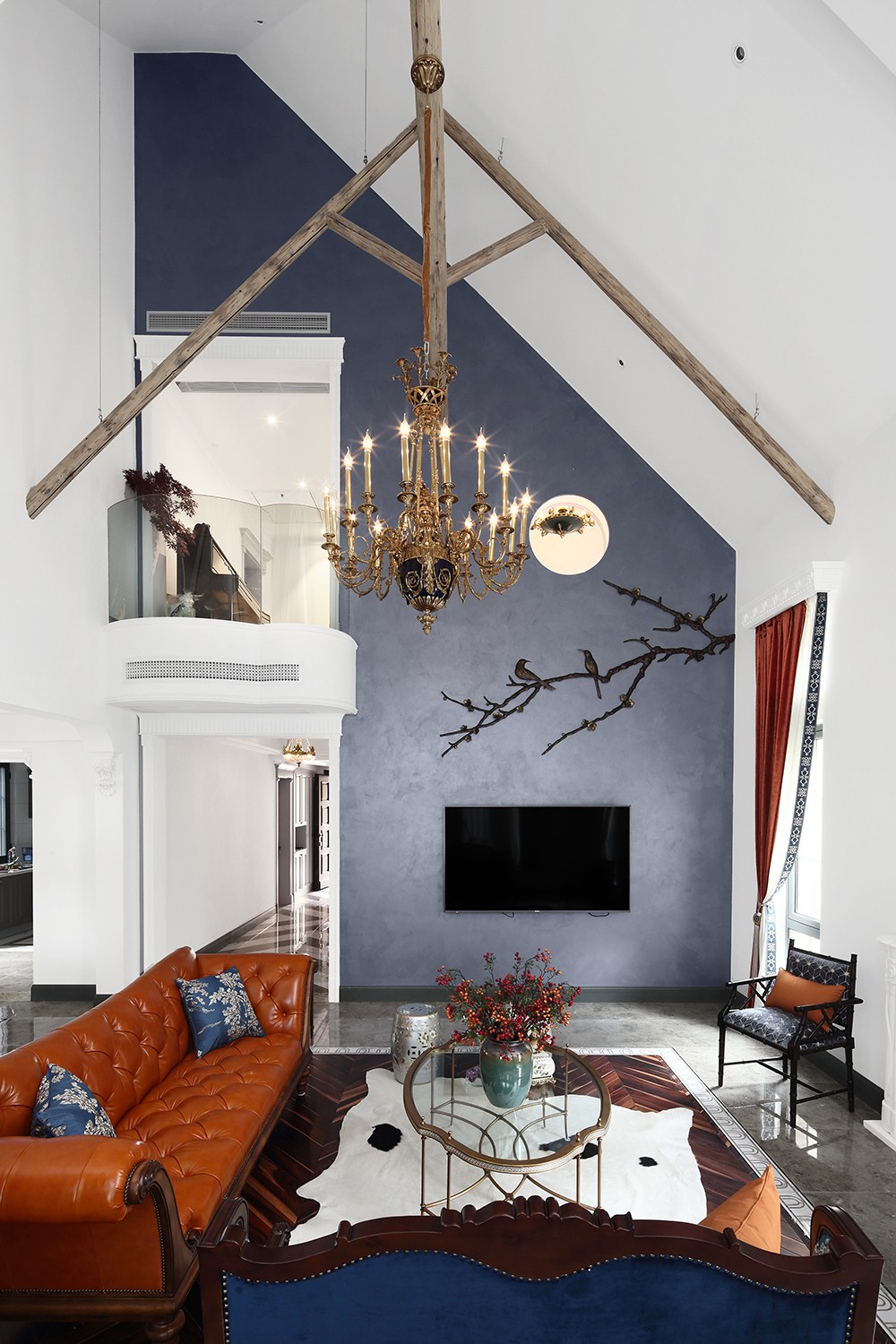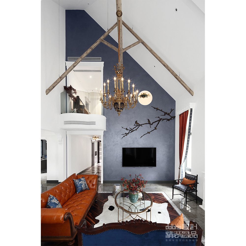 而客厅二楼的弧形平台,也是整个客厅设计中的点睛之笔。这个平台原本是不存在的,但是如果按照正常思路来摆放空调,则此处墙面一定会破坏整体性。而一旦转换设计思路,此问题就可以迎刃而解,我在此处直接设计了一个云型平台,一来保证了墙面的完整性,二来也增加了一个很有情调的内阳台空间。