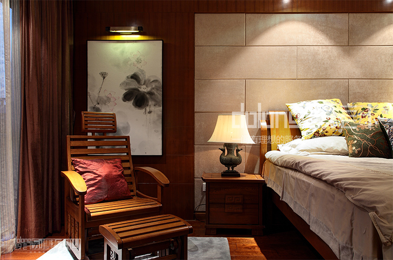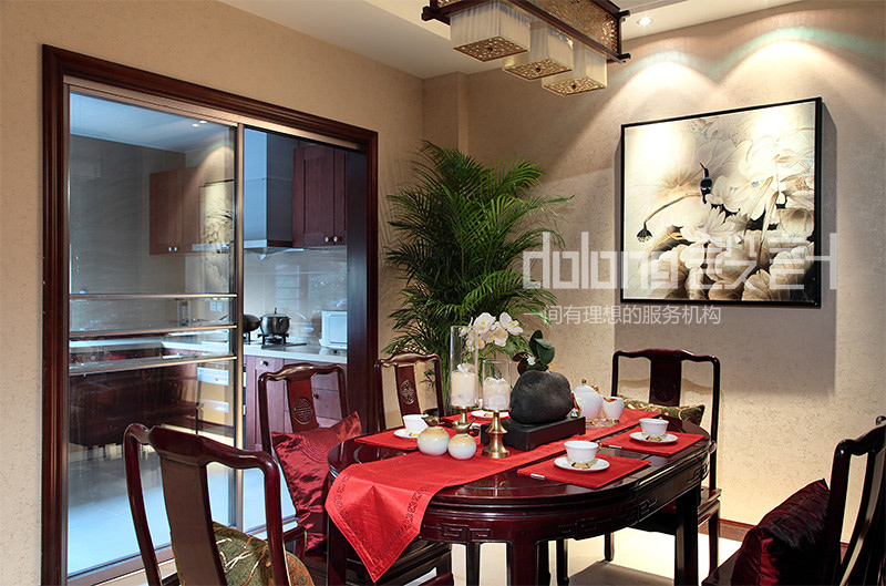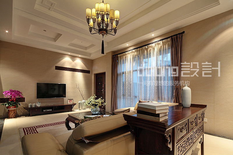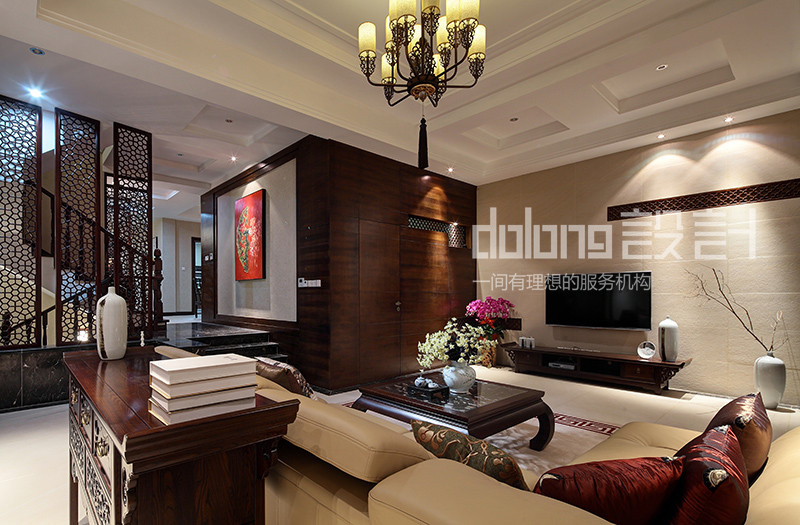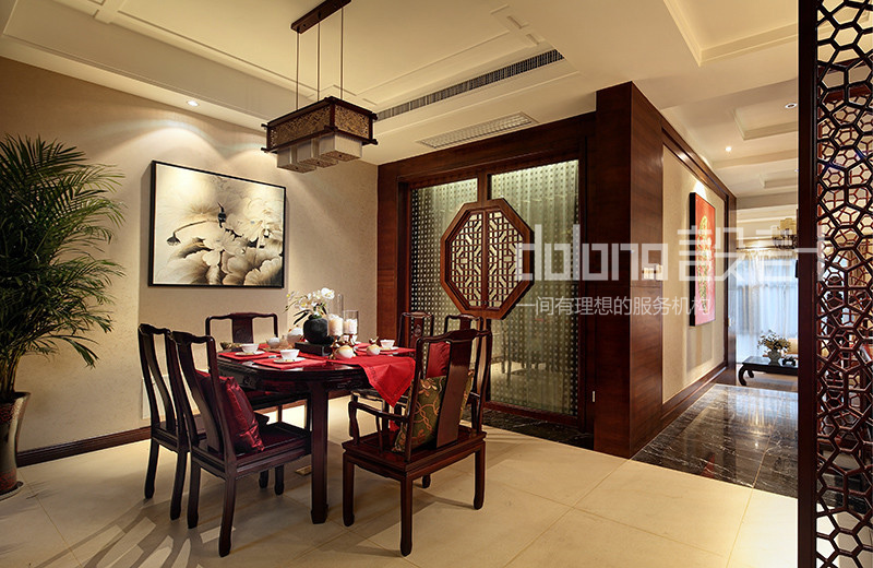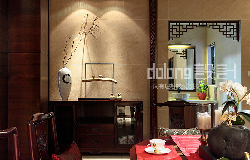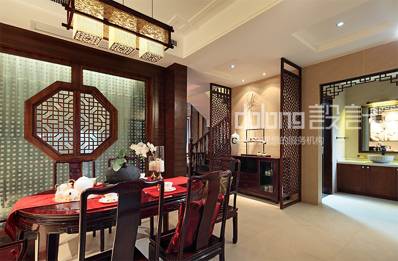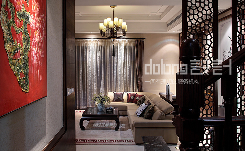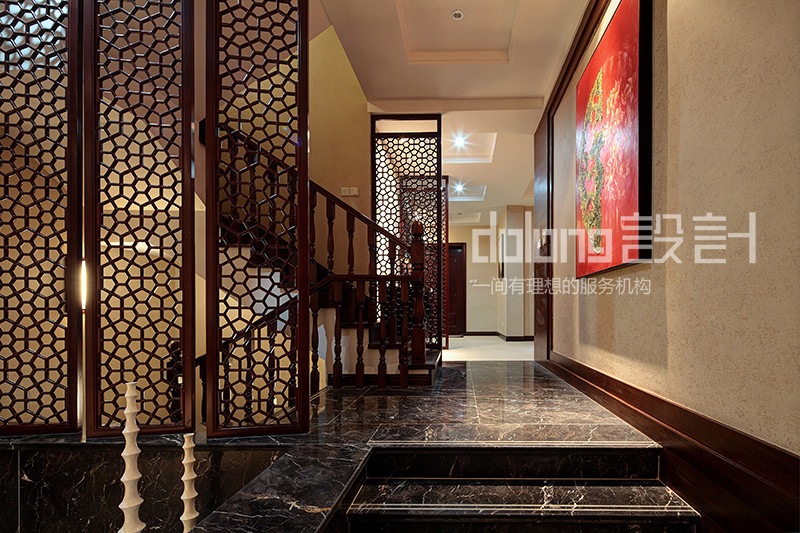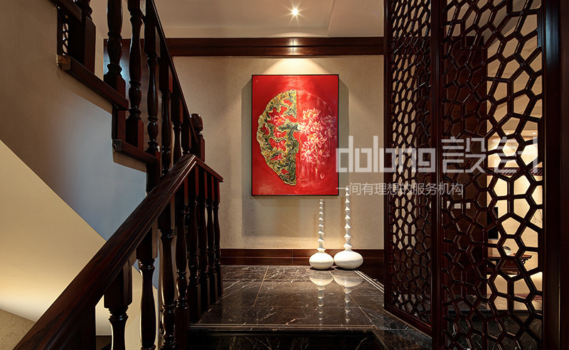 客厅与楼梯间精美的实木雕花,古韵十足的电视柜和茶几,优雅的祥云吊灯,无不流露着翩翩古韵,设计用材上也古意盎然,斑驳肌理的哑光瓷砖,稳重的柚木,典雅的暗纹墙纸,而那走道偶然出现的一抹红色,含蓄而有张力,热情的欢迎着每一个