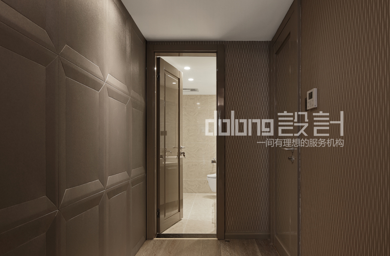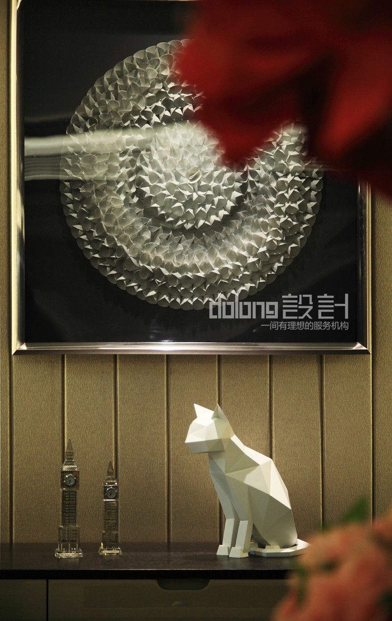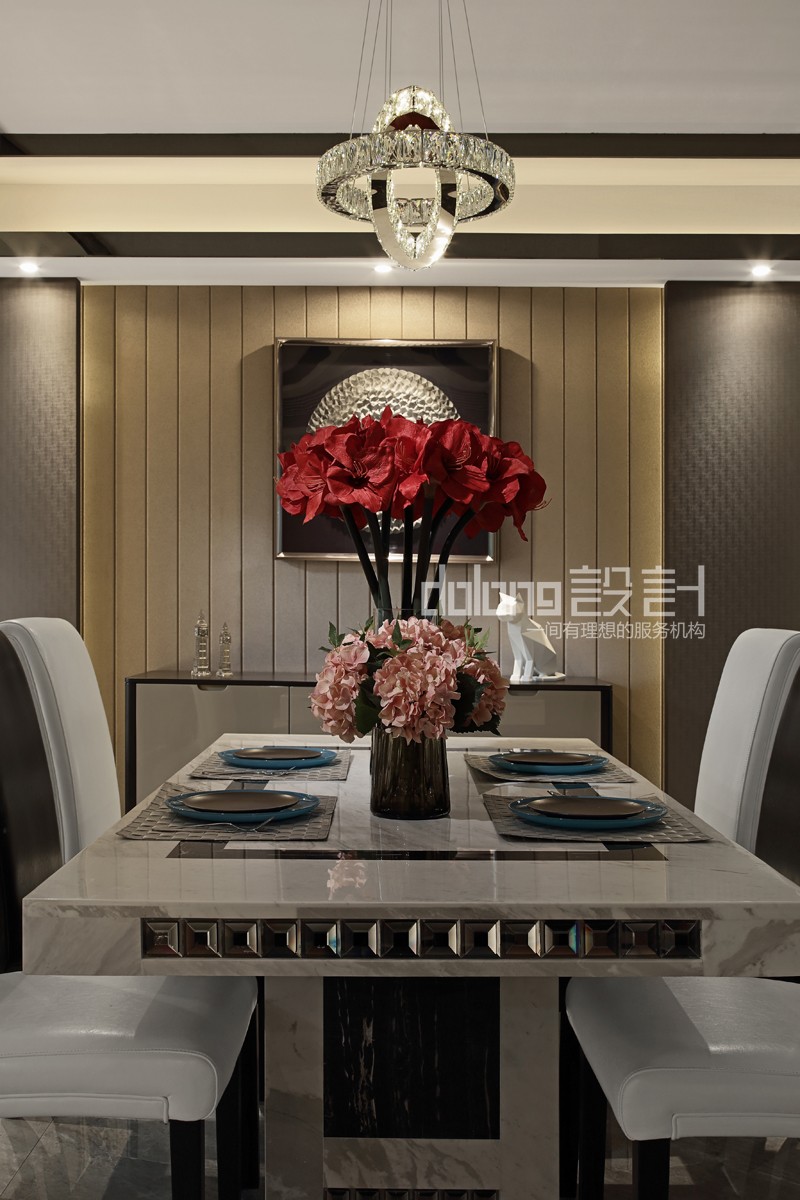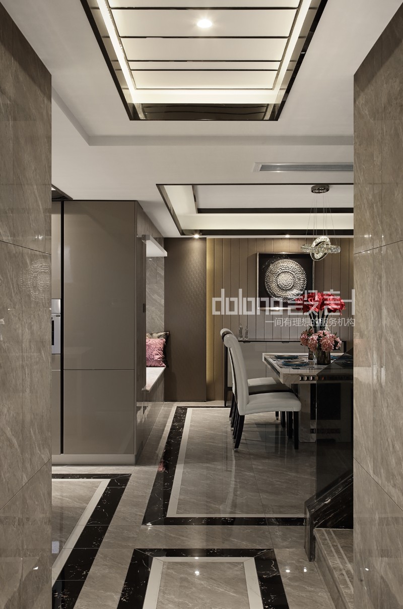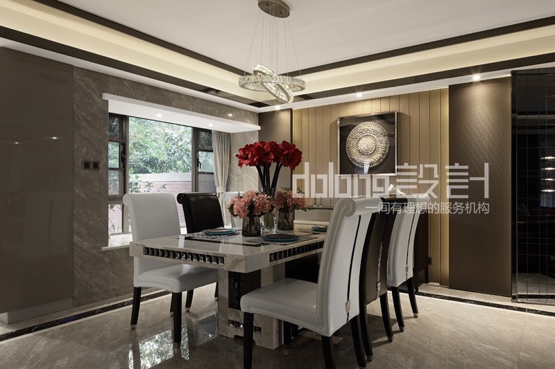 在首层的客餐厅公共空间中,由于住宅本身的层高较低,设计师用多种材质大量使用竖向线条造型,来削弱层高不足的劣势,造型丰富的大理石砖,条状硬包与不锈钢线条搭配出一种丰富的设计语言,散发着低调而华丽的空间氛围。餐厅的餐台上摆放着当代艺术家杨穹的几何猫雕塑,背后层层叠叠的皮质造型条竖向布置,充满韵律。客厅中低矮大气的复古沙发深浅搭配,背后是定制的一对1米高壁灯,散发出璀璨光芒。毗邻的餐厨空间设计师改出独立的西厨空间,有功能完善的内嵌冰箱,烤箱,蒸箱及电陶炉,让业主轻松自在地沉浸于弄厨之乐,与家人惬意地享用温馨早点。