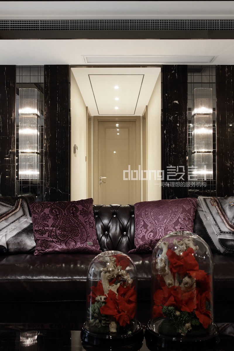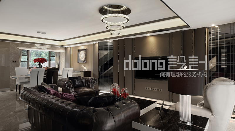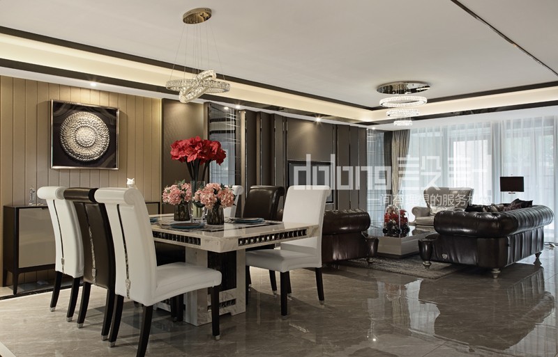 主要材料:皮质硬包,大理石砖,壁纸,黑钛不锈钢,艺术玻璃,实木多层地板等。