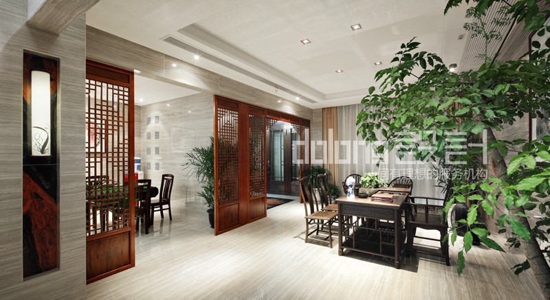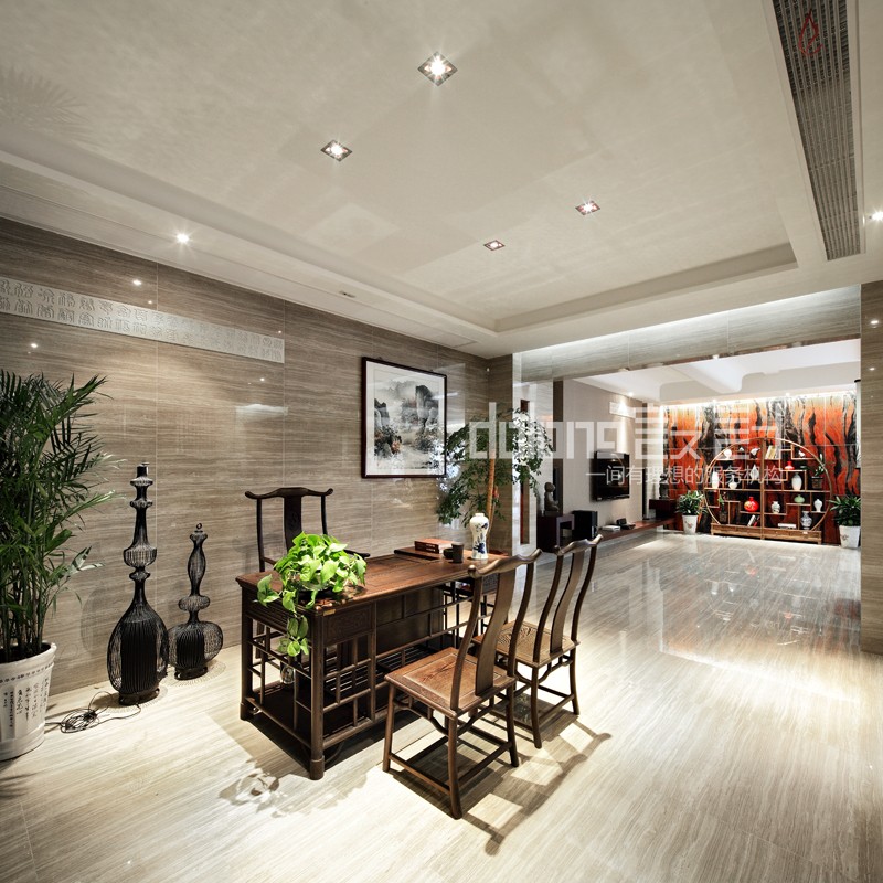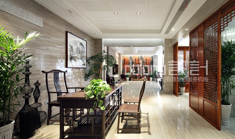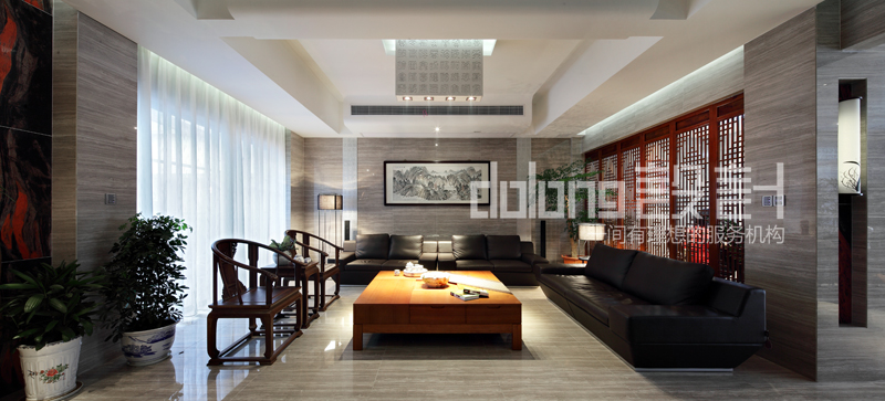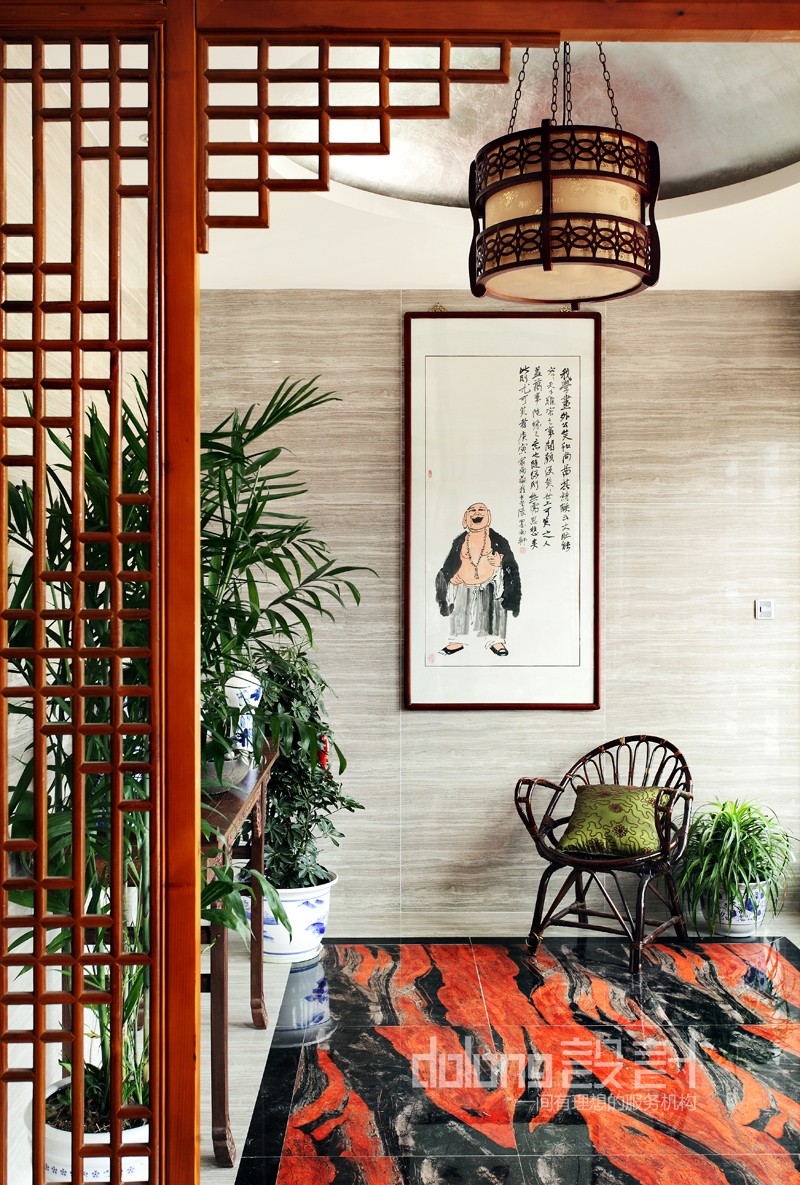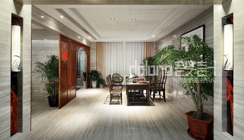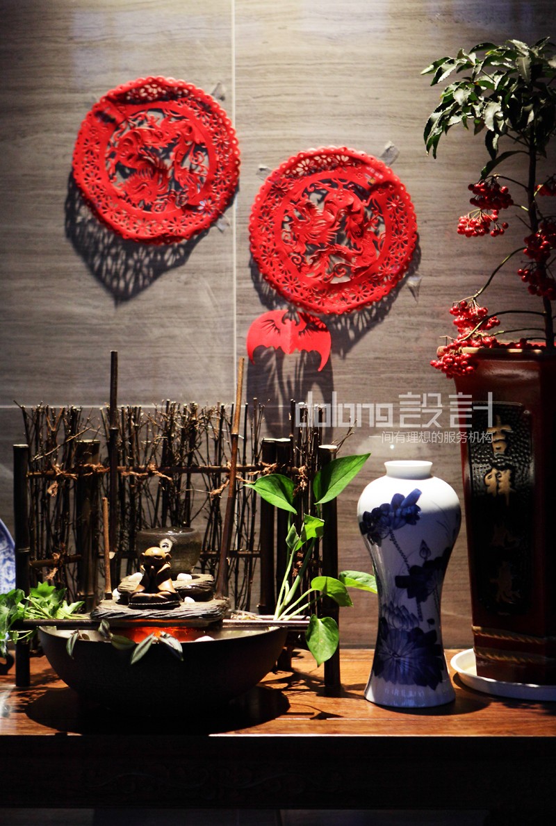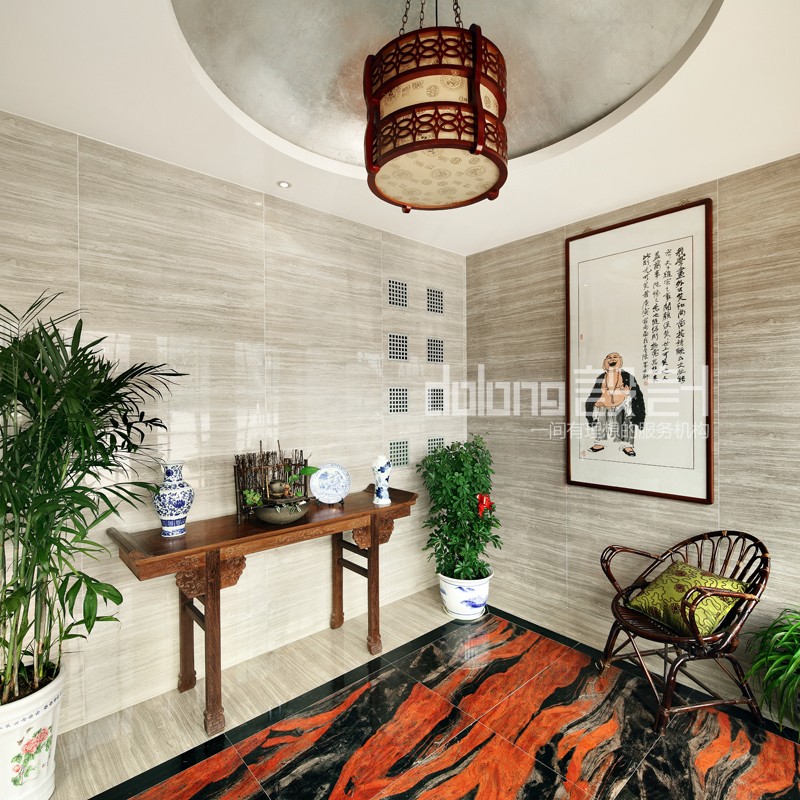 主要材料:木纹砖、水墨石、木雕、窗格、墙纸等