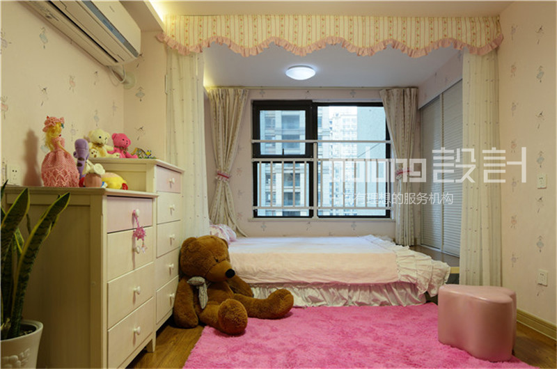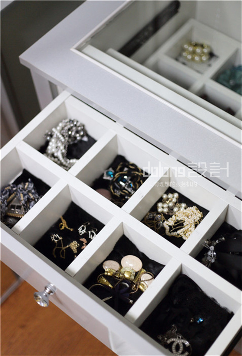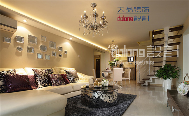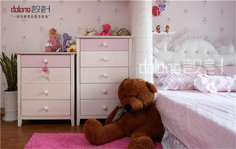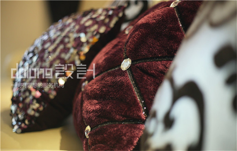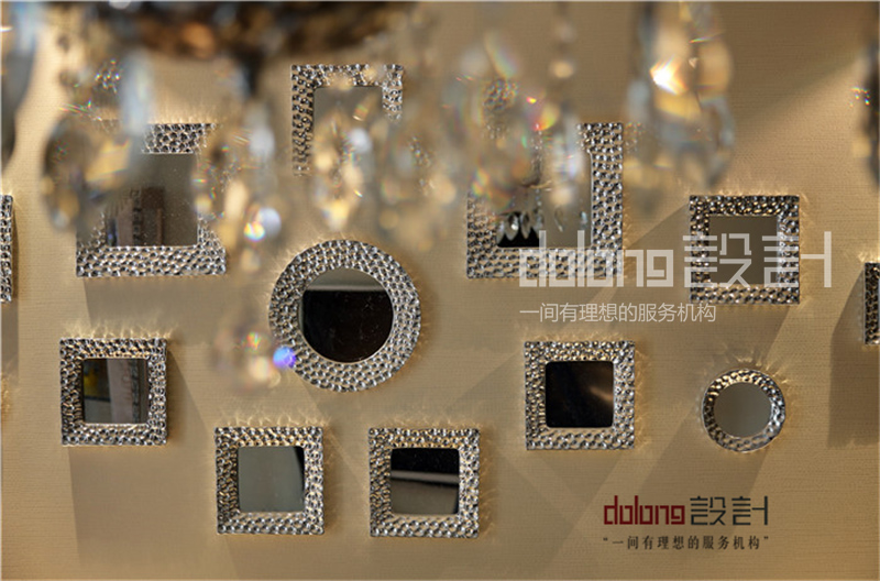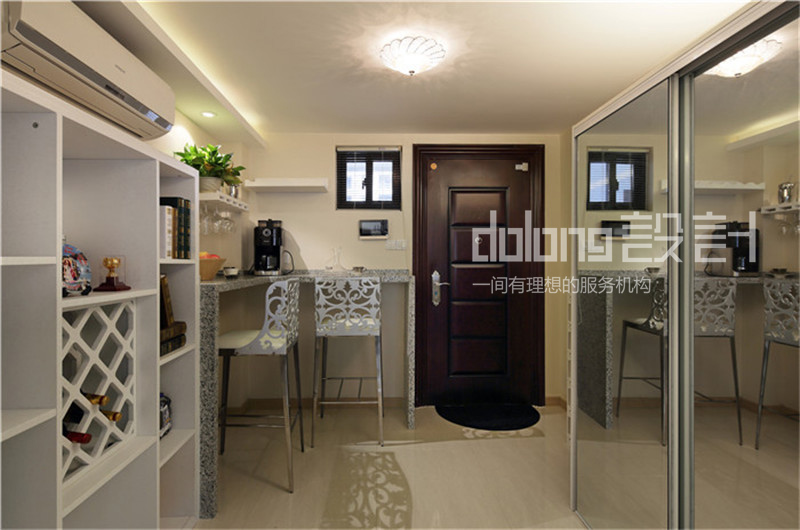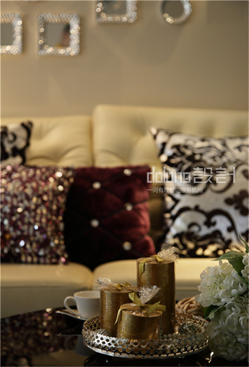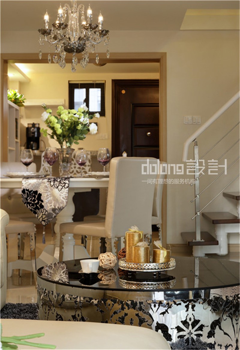 坐落于二楼的公共空间,变身敞开式书房。而女儿房的榻榻米部分则作为女儿床和衣帽间。时尚精致的女主人,不论在色彩还是材质上都倾向奢华的品质感。选用蛇皮纹的素色壁纸,皮质镶钻的家具,金属镂空的茶几和吧凳呼应,搭配水晶灯和镜面墙饰作为细节点缀。整个空间散发柔和的色彩在镶有水钻亮片的软装衬托下优雅奢华。