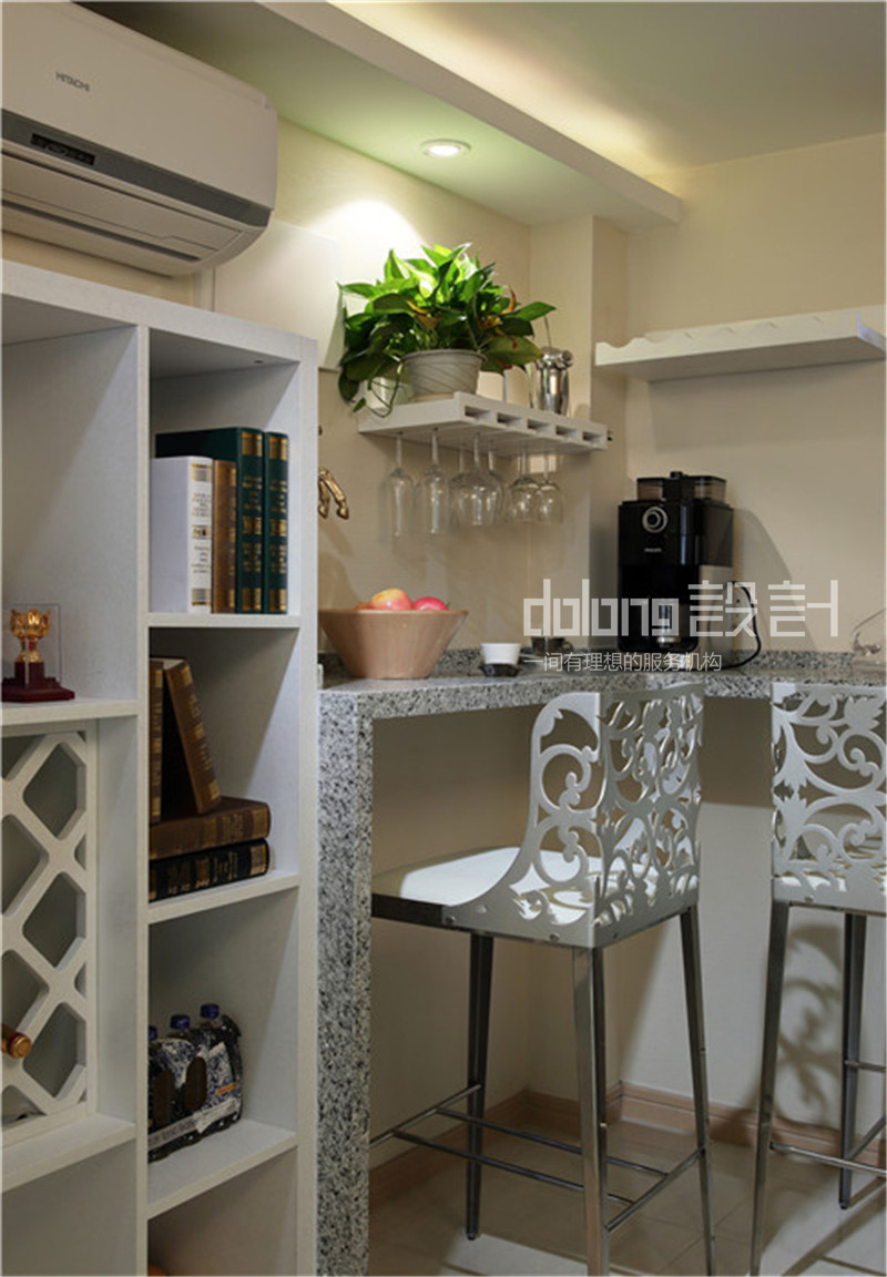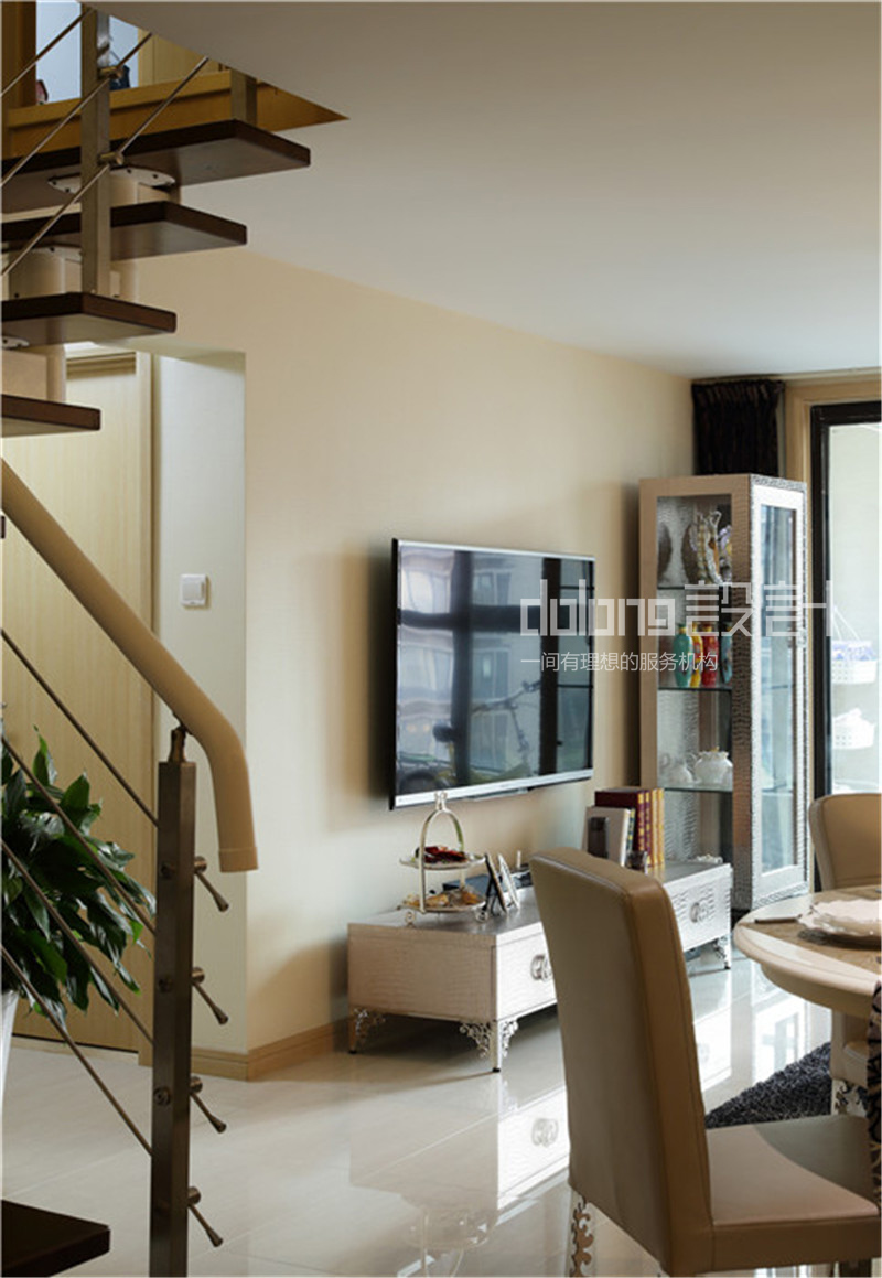 原有的空间已有墙面乳胶漆,地板地砖。但挑高的户型,较小的门厅,以及卧室已有的榻榻米,都需要重新规划平面布局。原做为餐厅的门厅改做了吧台和酒柜。女主人的烘焙,男主人的品酒爱好,都可在此完成。餐厅纳入客厅一角,选用功能性圆桌。即不占空间又满足业主好客的需求。
